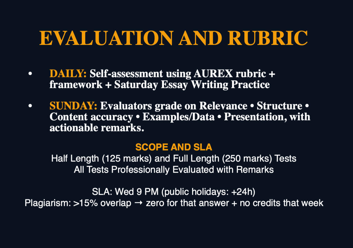 Most test series stop at just papers and solutions. AUREX runs an execution loop—daily writing, next-day frameworks, and deep grading every Sunday. The result is faster improvement and sustainable discipline.